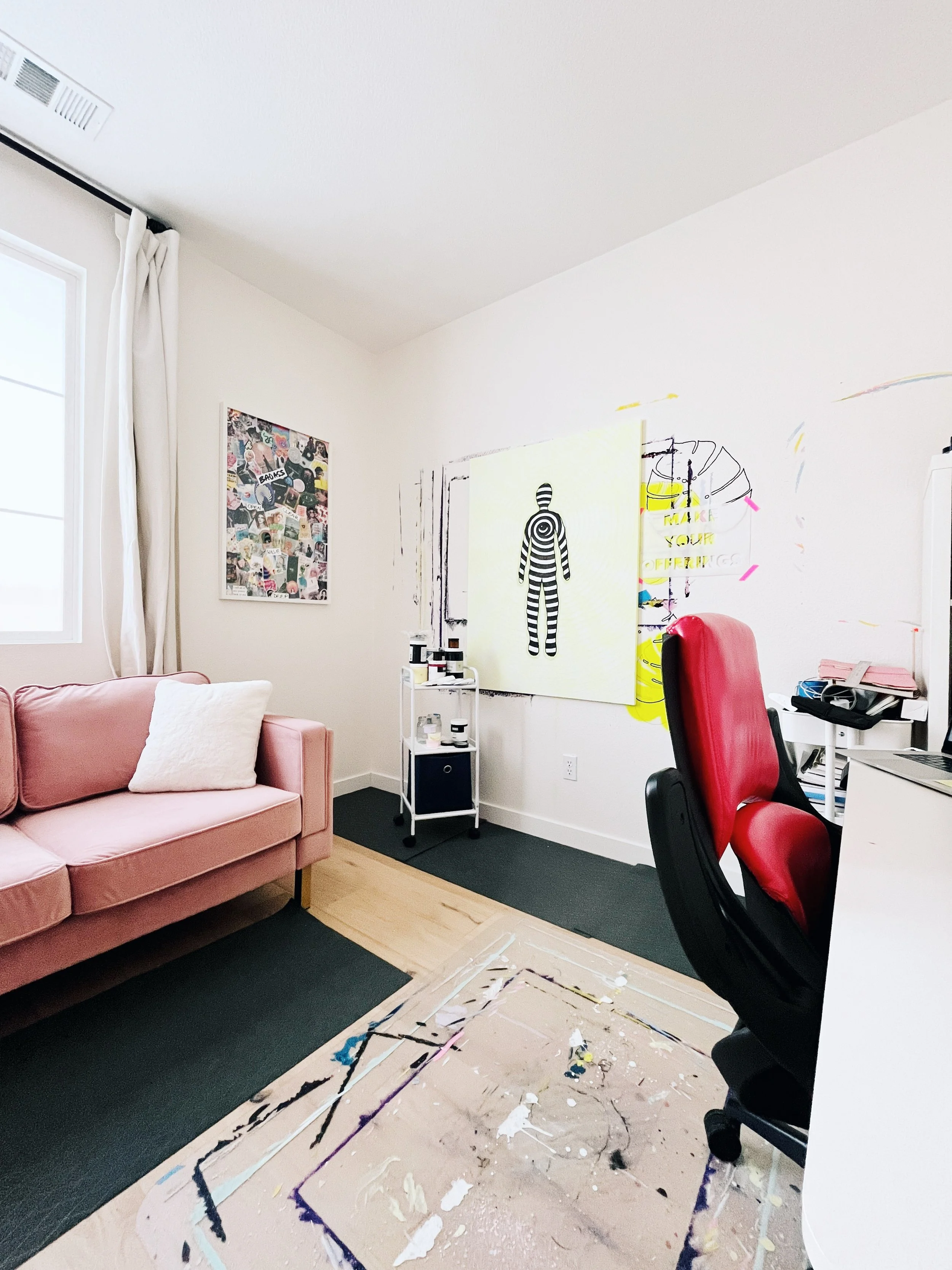 I work with acrylic, watercolor, markers, and spray paint on mixed media, blending bold color, symbols, and text. Through my art, I hope to spark conversations about generational trauma, healing, and the deep connection between our bodies, minds, and environments.